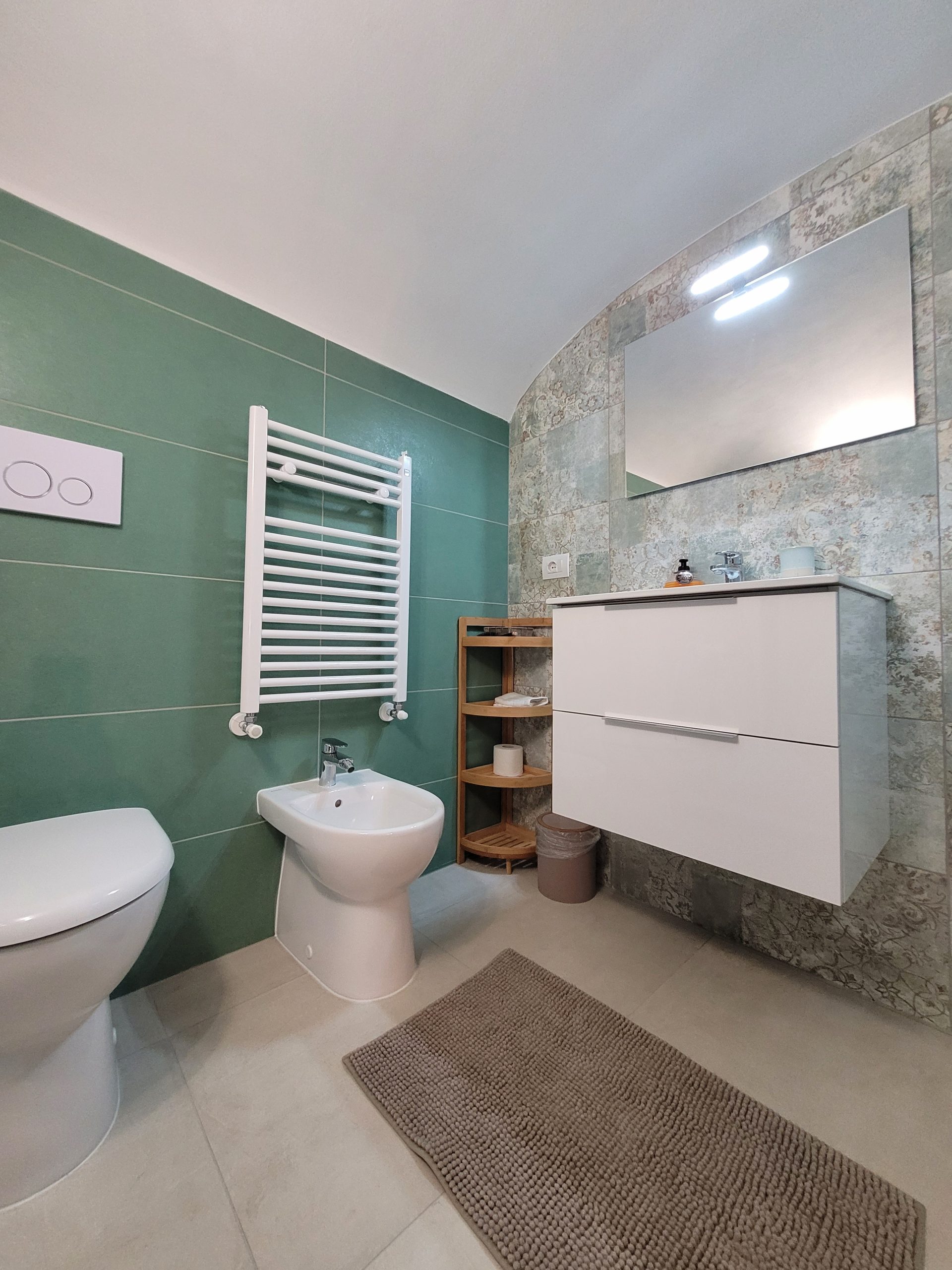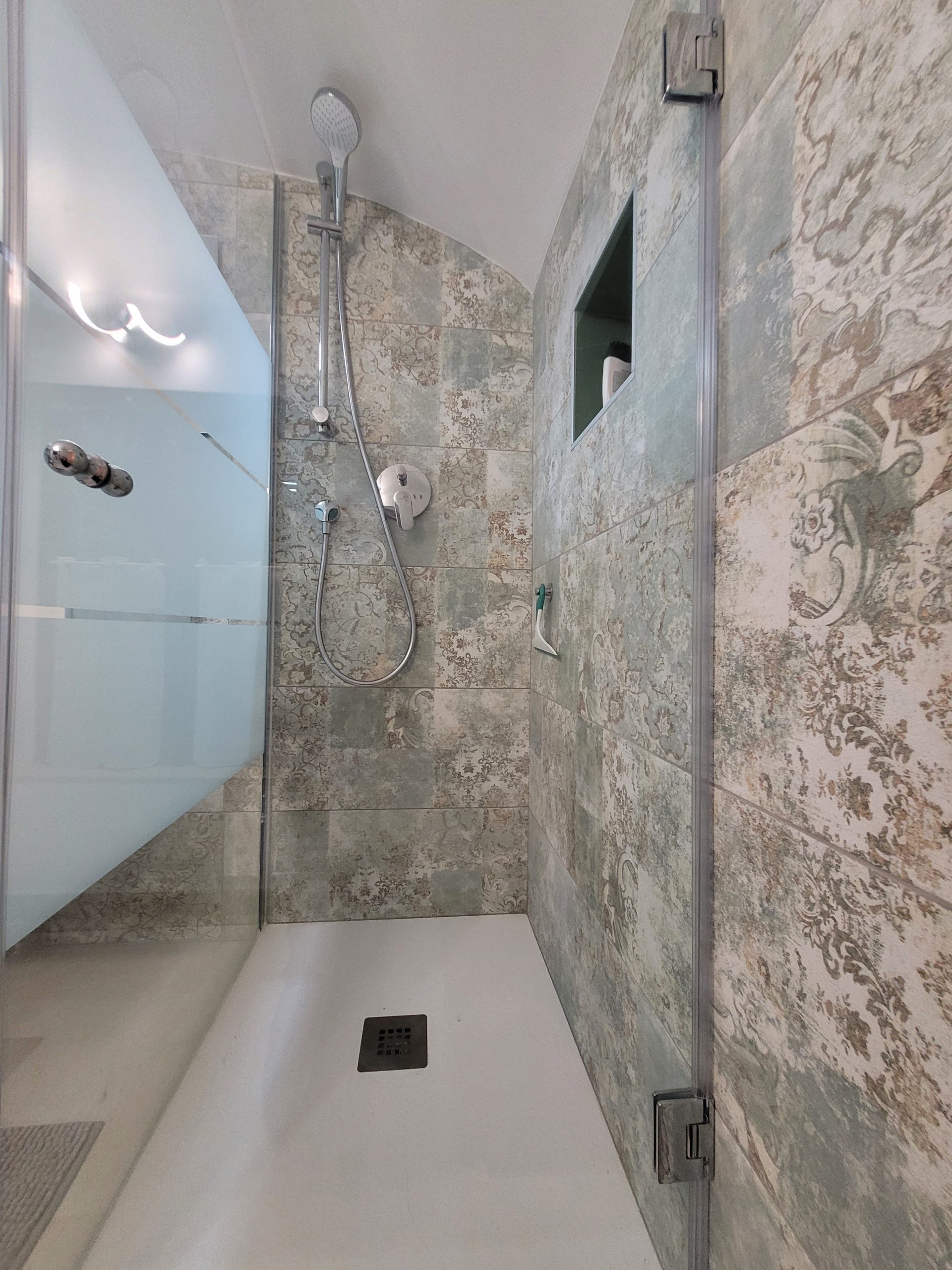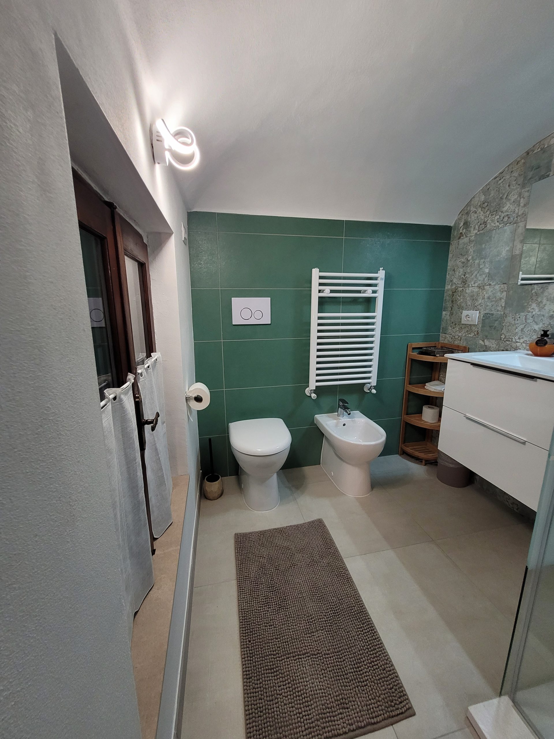 Das eigene kleine Bad mit Dusche, WC und Bidet ist über die originale, alte Holztreppe zu erreichen. Bei der Renovierung wurde sehr viel Wert darauf gelegt, den Charakter des alten Bauernhauses zu erhalten und trotzdem sollten moderne Standards erfüllt werden.